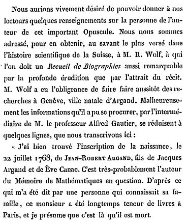 Tout d’abord, il est difficile de donner des indications biographiques sûres sur Argand lui-même. Nous pourrions reprendre ce qui a souvent été écrit : Jean-Robert Argand, mathématicien Suisse né à Genève en 1768, et installé à Paris comme libraire jusqu’à sa mort en 1822. Mais, dès la réédition de cet Essai en 1874 chez Gauthier-Villars, J. Houël précise dans sa préface :